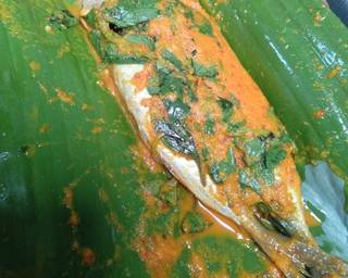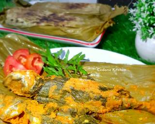 - Campurkan ikan dengan bumbu yang sudah dihaluskan, tambahkan kemangi. Aduk hingga rata. Ambil daun pisang, beri 2 ekor ikan, lalu bungkus dan tusuk dengan lidi.
